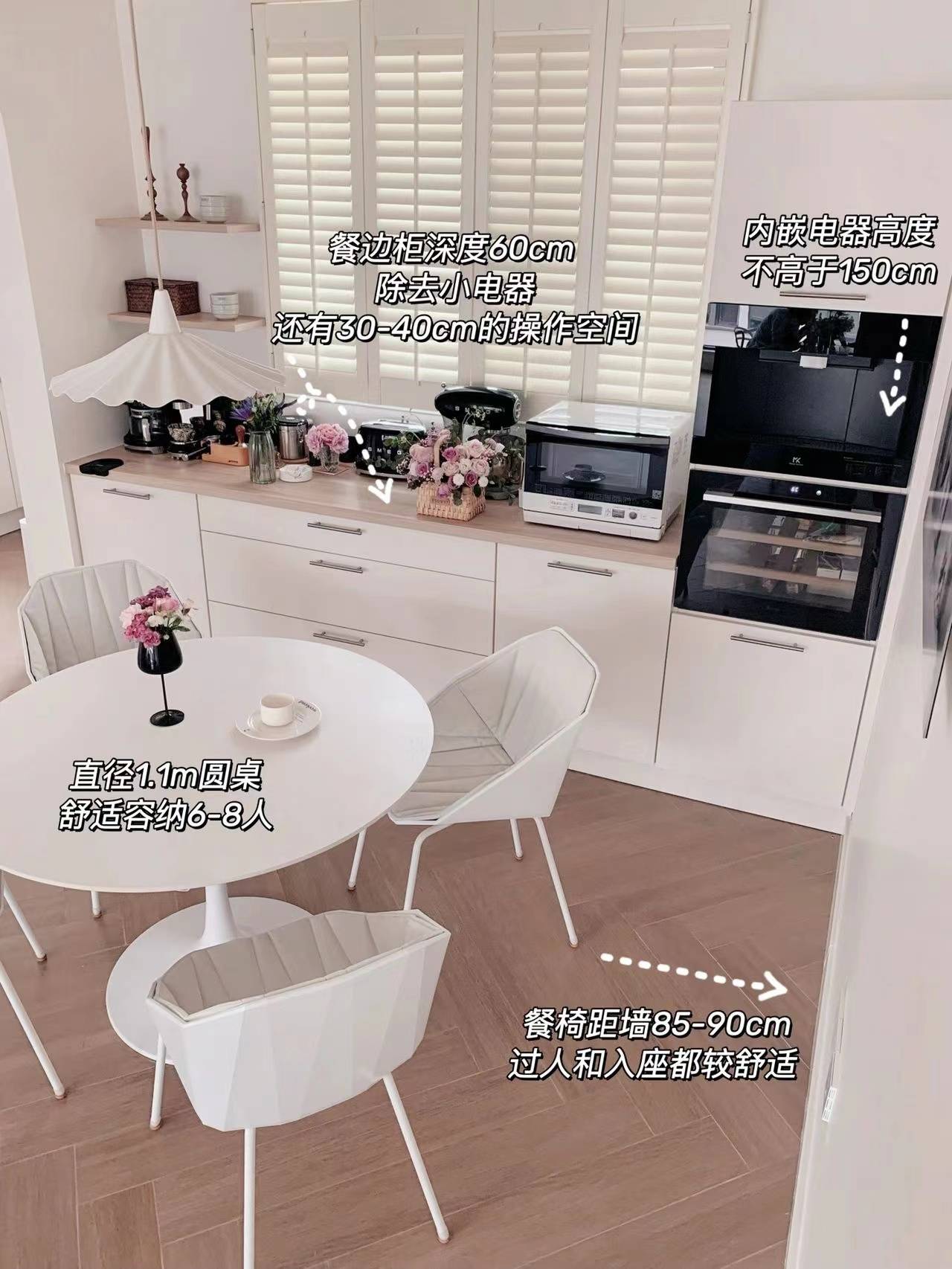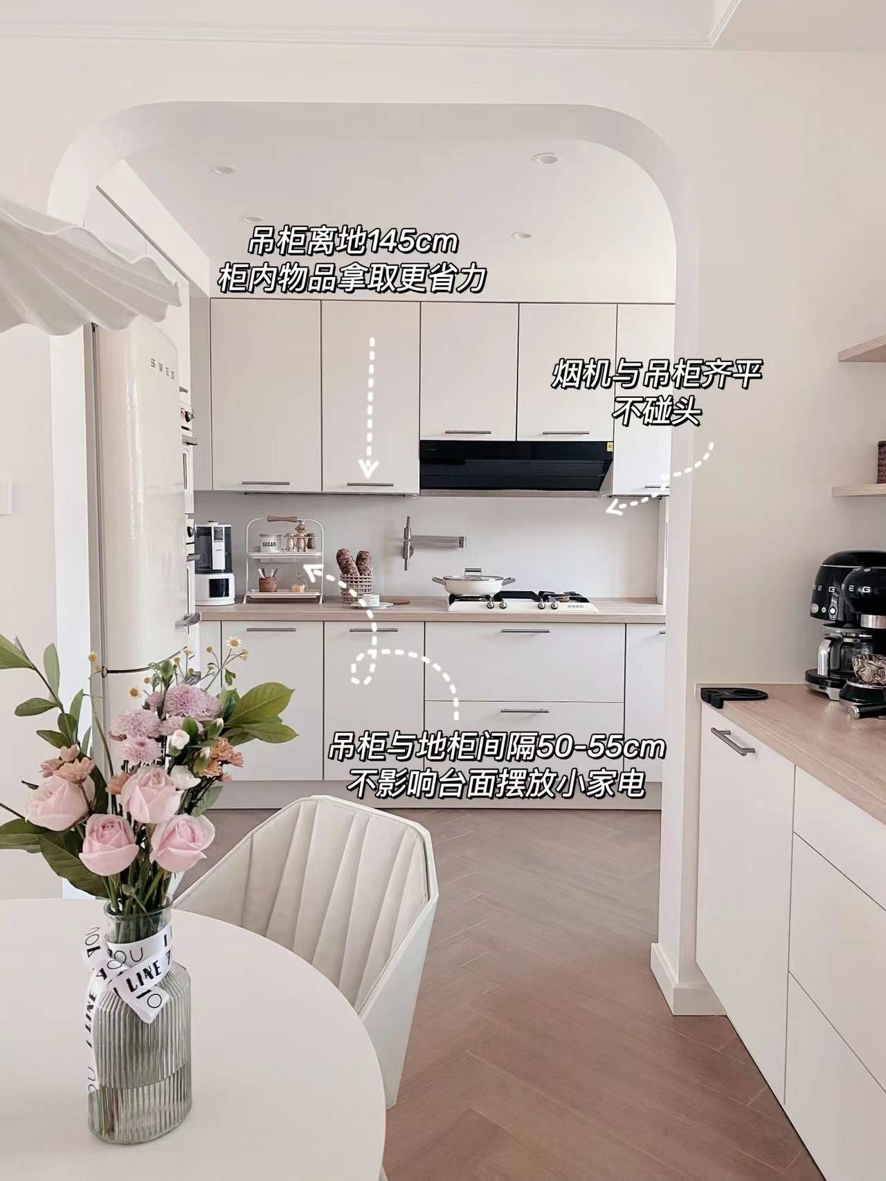 (9) 烟机与吊柜齐平,深度均为35cm,不容易碰头和遮挡视线)橱柜台面可利用高度不低于50-55cm,台面可以摆放大部分厨房电器