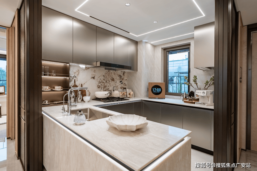 通过空间优化,百平米户型也能容纳“岛台+长桌”,岛台可嵌入蒸烤箱,烹饪后直接端上餐桌;台面还能当临时工作台,备餐时随时与家人闲谈,高效又温馨。