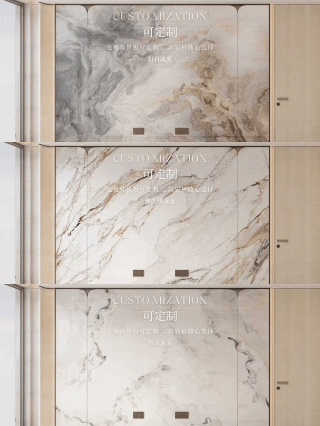 洋房定制同样采用「三重定制主义」,不仅从天奕时期的单一背景墙定制,升级为电视背景墙与厨房背景墙的一体化岩板定制,提供三大高端色系选择。