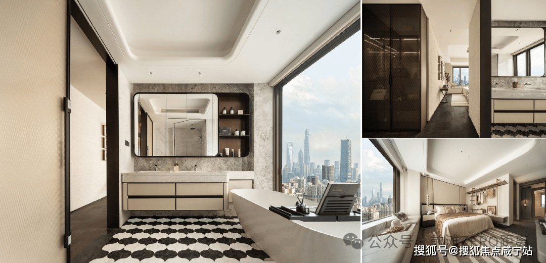 主卫空间以鱼肚灰大理石与博雅白台面精工对拼,防水防潮皮革,香奈儿灰与星耀灰石材拼花地面,升级独立浴缸与尺度双台盆,营造艺术馆般的奢享境界。